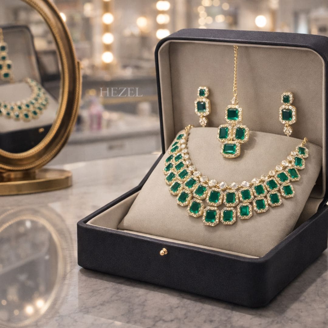 The Hezel Royal Emerald-Green Crystal Bridal Necklace Set is a magnificent expression of royal elegance and timeless bridal luxury. Designed with striking emerald-green rectangular crystals, this necklace set reflects grandeur, sophistication, and traditional charm.