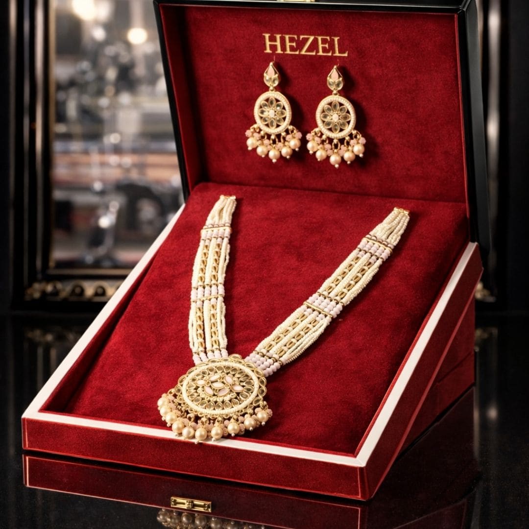 The Hezel Royal Kundan Grand Necklace Set is a magnificent expression of regal Indian craftsmanship and timeless elegance. Designed with beautifully set kundan stones and sparkling crystal accents on a radiant gold-polished base, this necklace set radiates royal charm and bridal luxury.