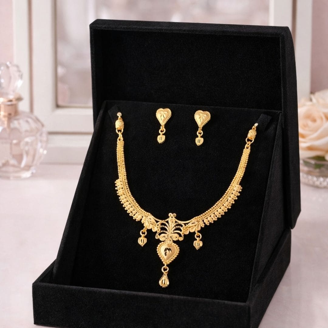 Made from a premium gold-tone alloy and finished with a smooth polished shine, the necklace frames the neckline beautifully while maintaining a lightweight and comfortable feel. The matching earrings echo the leaf-inspired detailing, completing a balanced and regal look.